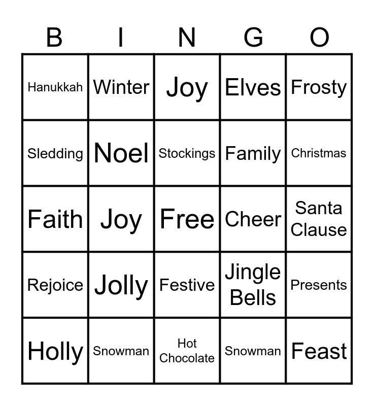This bingo card has a free space and 49 words: Caroling, Feast, Greetings, Hot Chocolate, Jolly, Ho, Ho, Ho!, Winter, Faith, Sledding, Cookies, Noel, Elves, Presents, Jingle Bells, Christmas Tree, Nutcracker, Stockings, Cheer, Ornament, Frosty, Joy, Snowman, Hanukkah, Family, Candle, Christmas, Holly, Celebrate, Festive, Rejoice, Blizzard, Icicle, Snow, Snowflake, Snowman, Wonderland, Mistletoe, Wreath, Santa Clause, Happy Holidays, Reindeer, Cookies, Elves, Frosty, Faith, Joy, Jolly, Greetings and Cheer.