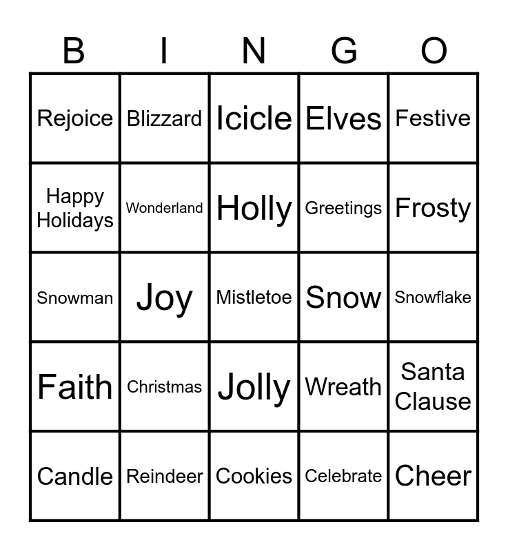 This bingo card has a free space and 24 words: Candle, Christmas, Holly, Celebrate, Festive, Rejoice, Blizzard, Icicle, Snow, Snowflake, Snowman, Wonderland, Wreath, Santa Clause, Happy Holidays, Reindeer, Cookies, Elves, Frosty, Faith, Joy, Jolly, Greetings and Cheer.