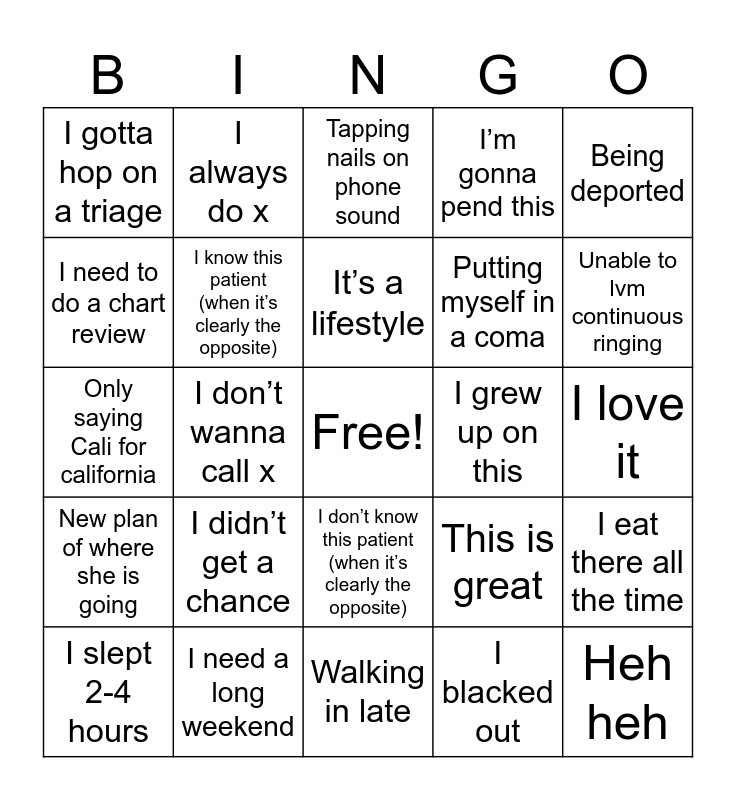 This bingo card has a free space and 24 words: I didn’t get a chance, I need a long weekend, It’s a lifestyle, I slept 2-4 hours, Being deported, I gotta hop on a triage, I need to do a chart review, I always do x, I grew up on this, I don’t know this patient (when it’s clearly the opposite), Putting myself in a coma, Only saying Cali for california, This is great, I eat there all the time, I know this patient (when it’s clearly the opposite), I blacked out, I love it, Tapping nails on phone sound, Unable to lvm continuous ringing, I don’t wanna call x, Heh heh, New plan of where she is going, I’m gonna pend this and Walking in late.