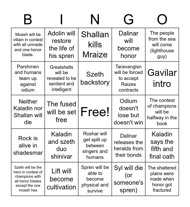 This bingo card has a free space and 24 words: Kaladin and szeth duo shinivar, Lift will become cultivation, Szeth backstory, Szeth will be the hero in contest of champions with all honor blades except the one moash has, The people from the sea will come (lighthouse guy), Moash will be villain in contest with all unmade and one honor blade., Parshmen and humans team up against odium, Adolin will restore the life of his spren, Odium doesn't lose but doesn't win, Roshar will get split up between singers and humans, Taravangisn will be forced to accept Raizes contracts, Neither Kaladin nor Shallan will die, Dalinar releases the heralds from their bonds, Kaladin says the fifth and final oath, Greatshells will be revealed to be sentient and intelligent, Syl will die (or someone's spren), The contest of champions will be halfway in the book, Shallan kills Mraize, Gavilar intro, The fused will be set free, The shattered plains were made when honor got fractured, Rock is alive in shadesmar, Dalinar will become honor and Spren will be able to become physical and survive.