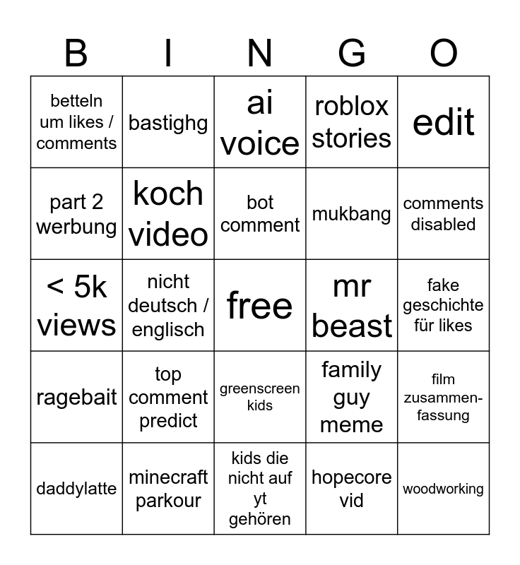 This bingo card has a free space and 34 words: chillguy, hopecore vid, kinderarbeit, fake core vid, ragebait, koch video, edit, daddylatte, bastighg, ghg't garnicht, bot comment, ai voice, prn, > 100m views, mr beast, comments disabled, minecraft parkour, < 5k views, top comment predict, family guy meme, greenscreen kids, furry / femboy, betteln um likes / comments, fake geschichte für likes, kids die nicht auf yt gehören, woodworking, roblox stories, reddit stories, mukbang, part 2 werbung, werbung in video, nicht deutsch / englisch, film zusammen- fassung and pc build.