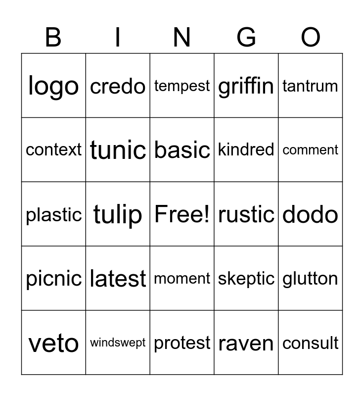 This bingo card has a free space and 29 words: veto, construct, tulip, resist, logo, tempest, tunic, latest, rustic, windswept, dodo, consult, protest, raven, comment, Mavis, moment, picnic, tantrum, plastic, skeptic, conduct, kindred, context, griffin, credo, glutton, basic and gluten.