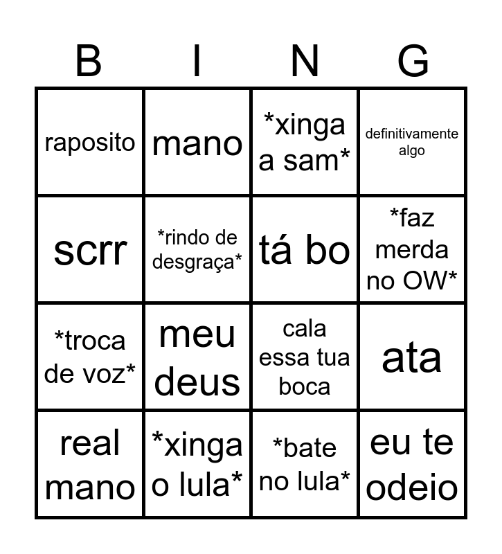 This bingo card has 16 words: real mano, *xinga o lula*, *xinga a sam*, definitivamente algo, scrr, mano, cala essa tua boca, ata, raposito, *rindo de desgraça*, *bate no lula*, *faz merda no OW*, *troca de voz*, meu deus, tá bo and eu te odeio.