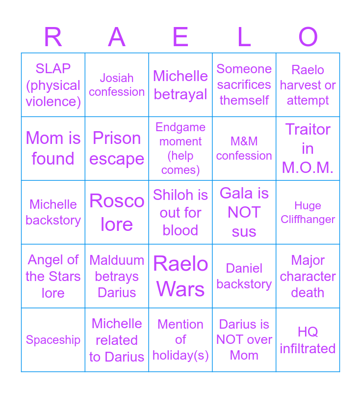 This bingo card has a free space and 24 words: Malduum betrays Darius, Michelle related to Darius, Endgame moment (help comes), Spaceship, Raelo harvest or attempt, SLAP (physical violence), Mom is found, Josiah confession, Gala is NOT sus, Raelo Wars, M&M confession, Michelle backstory, Daniel backstory, Major character death, Prison escape, Darius is NOT over Mom, Huge Cliffhanger, Michelle betrayal, Traitor in M.O.M., Rosco lore, HQ infiltrated, Angel of the Stars lore, Someone sacrifices themself and Mention of holiday(s).