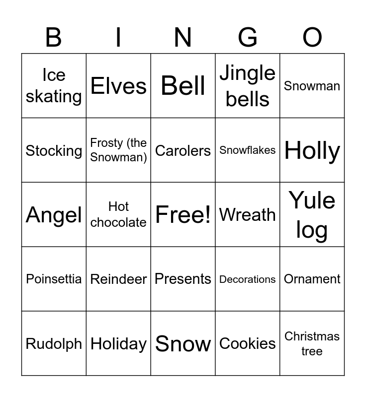 This bingo card has a free space and 50 words: Santa, Christmas tree, Gifts, Snow, Reindeer, Sleigh, Elves, Mistletoe, Stocking, North Pole, Frosty (the Snowman), Jingle bells, Ornament, Decorations, Candy cane, Lights, Carolers, Wreath, Tinsel, Snowman, Hot chocolate, Cookies, Ice skating, Snowflakes, Advent, Gingerbread, Holly, Fireplace, Bell, Presents, Christmas Eve, Christmas Day, Wrapping paper, Naughty or nice, Holiday, Joy, Peace, Merry, Celebration, Yule log, Winter, Grinch, Nativity, Bethlehem, Rudolph, Angel, Santa’s workshop, Chimney, Poinsettia and Magic.