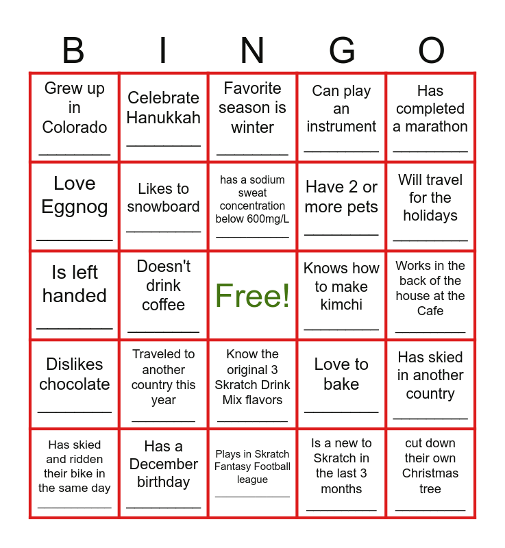 This bingo card has a free space and 24 words: Traveled to another country this year _________, Has a December birthday _________, has a sodium sweat concentration below 600mg/L ____________, Has skied and ridden their bike in the same day ___________, Has completed a marathon _________, Grew up in Colorado ________, Love Eggnog _______, Celebrate Hanukkah ________, Knows how to make kimchi _________, Know the original 3 Skratch Drink Mix flavors __________, Have 2 or more pets ________, Is left handed _______, Love to bake ________, Has skied in another country _________, Likes to snowboard _________, Is a new to Skratch in the last 3 months __________, Works in the back of the house at the Cafe __________, Favorite season is winter ________, Will travel for the holidays _________, Doesn't drink coffee ________, cut down their own Christmas tree __________, Dislikes chocolate ________, Can play an instrument _________ and Plays in Skratch Fantasy Football league _____________.