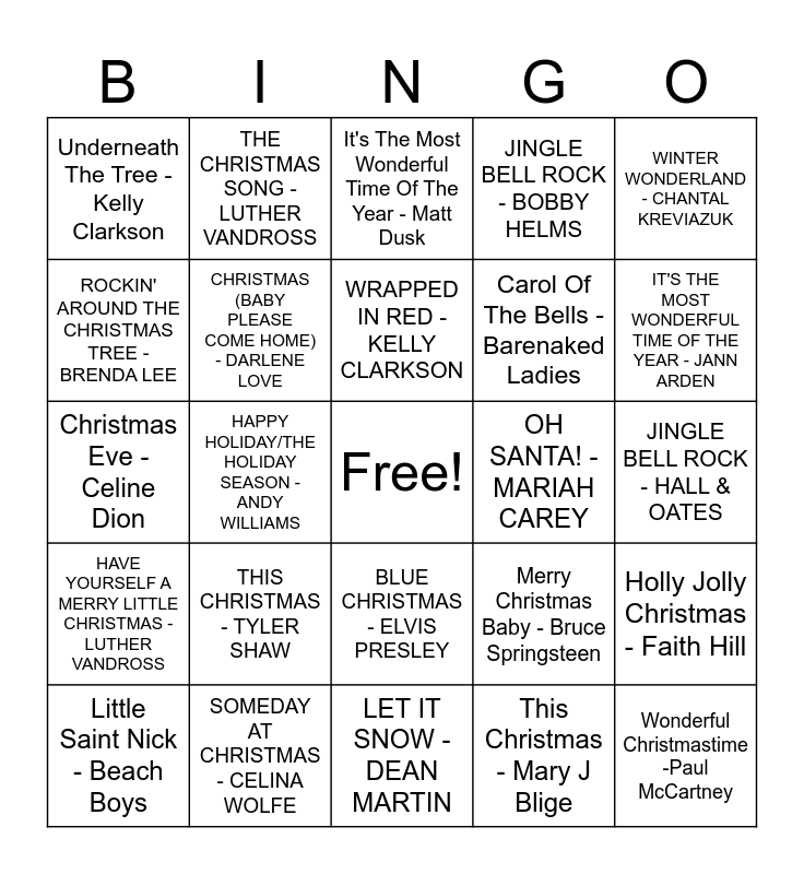 This bingo card has a free space and 48 words: JINGLE BELLS - FRANK SINATRA, Wonderful Christmastime -Paul McCartney, I'LL BE HOME FOR CHRISTMAS - THE TENORS, LET IT SNOW - DEAN MARTIN, THIS CHRISTMAS - TYLER SHAW, The Christmas Song - Nat King Cole, THE CHRISTMAS SONG - LUTHER VANDROSS, Mistletoe - Colbie Caillat, ROCKIN' AROUND THE CHRISTMAS TREE - BRENDA LEE, Home this Christmas - Justin Bieber feat. The Band Perry, CHRISTMAS (BABY PLEASE COME HOME) - DARLENE LOVE, JINGLE BELL ROCK - BOBBY HELMS, Holly Jolly Christmas - Faith Hill, Merry Christmas Baby - Bruce Springsteen, IT'S A MARSHMALLOW WORLD - KIM STOCKWOOD, RUDOLPH THE RED NOSED REINDEER - BURL IVES, WRAPPED IN RED - KELLY CLARKSON, OH SANTA! - MARIAH CAREY, NO PLACE LIKE HOME FOR THE HOLIDAYS - PERRY COMO, WINTER WONDERLAND - CHANTAL KREVIAZUK, HAPPY HOLIDAY/THE HOLIDAY SEASON - ANDY WILLIAMS, This Christmas - Mary J Blige, Underneath The Tree - Kelly Clarkson, Carol Of The Bells - Barenaked Ladies, SLEIGH RIDE - RONETTES, IT'S THE MOST WONDERFUL TIME OF THE YEAR - JANN ARDEN, Little Saint Nick - Beach Boys, Mistletoe - Justin Bieber, BLUE CHRISTMAS - ELVIS PRESLEY, HAVE YOURSELF A MERRY LITTLE CHRISTMAS - LUTHER VANDROSS, I Saw Mommy Kissing Santa Claus - John Mellencamp, Happy Xmas - Sarah McLachlan, DRIVING HOME FOR CHRISTMAS - CHRIS REA, Step Into Christmas - Elton John, SOMEDAY AT CHRISTMAS - CELINA WOLFE, THE LITTLE DRUMMER BOY - BOB SEGER, I'LL BE HOME FOR CHRISTMAS - SERENA RYDER, JINGLE BELL ROCK - HALL & OATES, Winter Wonderland - Eurythmics, It's Christmastime - Barenaked Ladies, Do They Know It's Christmas - Band Aid, IT'S BEGINNING TO LOOK A LOT LIKE CHRISTMAS - JANN ARDEN, It's The Most Wonderful Time Of The Year - Matt Dusk, White Christmas - Bing Crosby, Christmas Eve - Celine Dion, Believe - Josh Groban, Merry Christmas Happy Holidays - N Sync and Let It Snow - Frank Sinatra.