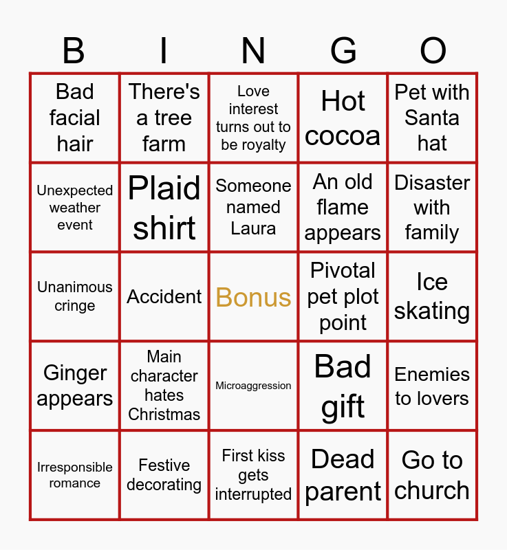 This bingo card has a free space and 50 words: Scene in diner, Main character hates Christmas, White main couple, Coffee shop, Enemies to lovers, It starts snowing, There's a tree farm, Slay ride, An old flame appears, Drives a truck, Unexpected weather event, Plaid shirt, Dead parent, Go to church, Nosy best friend, Character moves to city, Love interest turns out to be royalty, Pivotal pet plot point, A guy named Nick, Bad facial hair, Accident, First kiss gets interrupted, Hot cocoa, Disaster with family, Santa appears, Festive decorating, Someone named Laura, Someone named Craig, Pet with Santa hat, Ginger appears, Mistletoe, Family inheritance, Illegal activity, Christmas dinner, Misunderstanding, Irresponsible romance, Cancelled flight, Christmas shopping, Break up, Ice skating, Christmas Market, Snowball Fight, Microaggression, Someone in vc gets annoyed, Movie paused due to laughter, Unanimous cringe, Paranormal activity, Pregnancy (unwanted), Bad gift and Proposal.