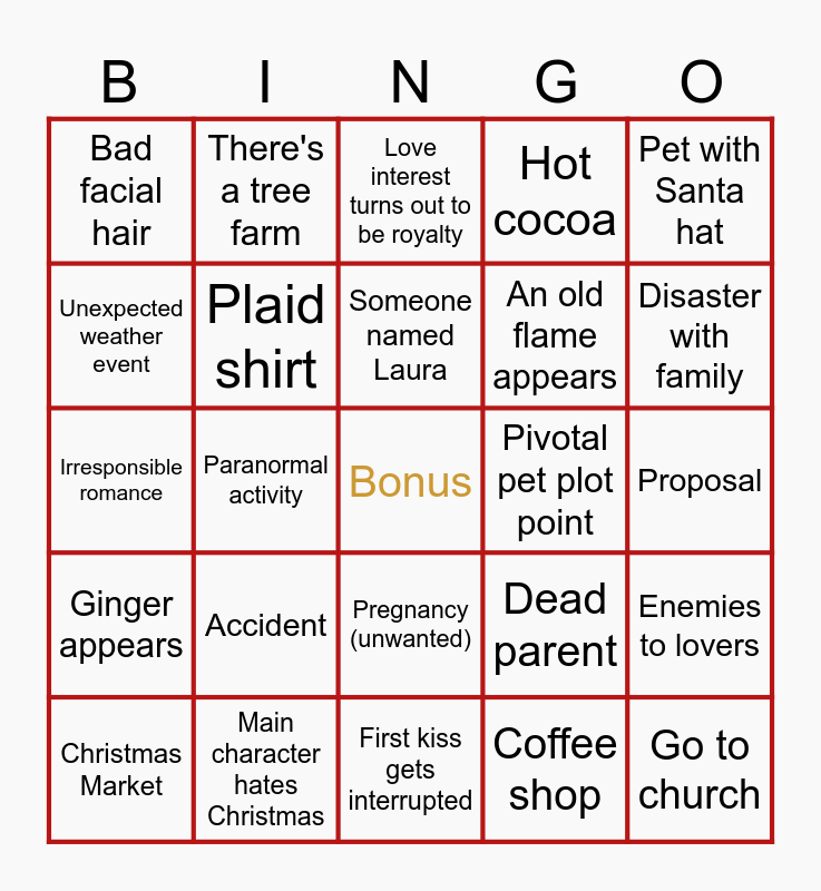 This bingo card has a free space and 50 words: Scene in diner, Main character hates Christmas, White main couple, Coffee shop, Enemies to lovers, It starts snowing, There's a tree farm, Slay ride, An old flame appears, Drives a truck, Unexpected weather event, Plaid shirt, Dead parent, Go to church, Nosy best friend, Character moves to city, Love interest turns out to be royalty, Pivotal pet plot point, A guy named Nick, Bad facial hair, Accident, First kiss gets interrupted, Hot cocoa, Disaster with family, Santa appears, Festive decorating, Someone named Laura, Someone named Craig, Pet with Santa hat, Ginger appears, Family inheritance, Illegal activity, Christmas dinner, Misunderstanding, Mistletoe, Cancelled flight, Christmas shopping, Break up, Ice skating, Irresponsible romance, Snowball Fight, Microaggression, Someone in vc gets annoyed, Movie paused due to laughter, Christmas Market, Paranormal activity, Pregnancy (unwanted), Bad gift, Proposal and Unanimous cringe.