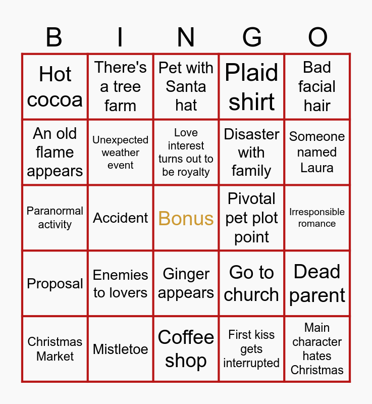 This bingo card has a free space and 50 words: Scene in diner, Main character hates Christmas, White main couple, Coffee shop, Enemies to lovers, It starts snowing, There's a tree farm, Slay ride, An old flame appears, Drives a truck, Unexpected weather event, Plaid shirt, Dead parent, Go to church, Nosy best friend, Character moves to city, Love interest turns out to be royalty, Pivotal pet plot point, A guy named Nick, Bad facial hair, Accident, First kiss gets interrupted, Hot cocoa, Disaster with family, Santa appears, Festive decorating, Someone named Laura, Someone named Craig, Pet with Santa hat, Ginger appears, Family inheritance, Illegal activity, Christmas dinner, Misunderstanding, Mistletoe, Cancelled flight, Christmas shopping, Break up, Ice skating, Irresponsible romance, Snowball Fight, Microaggression, Someone in vc gets annoyed, Movie paused due to laughter, Christmas Market, Paranormal activity, Pregnancy (unwanted), Bad gift, Proposal and Unanimous cringe.