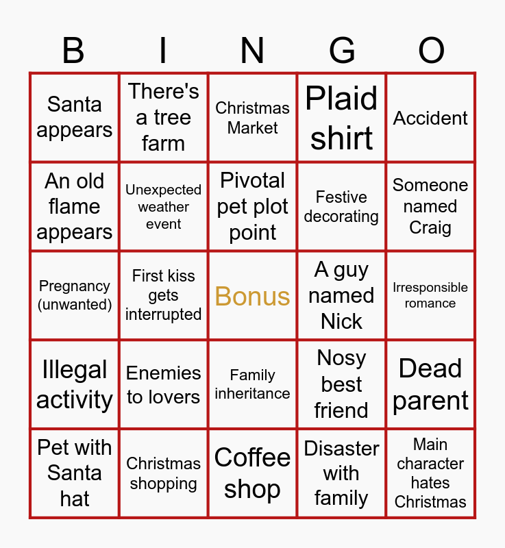 This bingo card has a free space and 48 words: Scene in diner, Main character hates Christmas, White main couple, Coffee shop, Enemies to lovers, It starts snowing, There's a tree farm, Slay ride, An old flame appears, Drives a truck, Unexpected weather event, Plaid shirt, Dead parent, Nosy best friend, Character moves to city, Love interest turns out to be royalty, Pivotal pet plot point, A guy named Nick, Bad facial hair, Accident, First kiss gets interrupted, Disaster with family, Santa appears, Festive decorating, Someone named Laura, Someone named Craig, Pet with Santa hat, Ginger appears, Family inheritance, Illegal activity, Christmas dinner, Misunderstanding, Mistletoe, Cancelled flight, Christmas shopping, Break up, Ice skating, Irresponsible romance, Snowball Fight, Microaggression, Someone in vc gets annoyed, Movie paused due to laughter, Christmas Market, Paranormal activity, Pregnancy (unwanted), Bad gift, Proposal and Unanimous cringe.