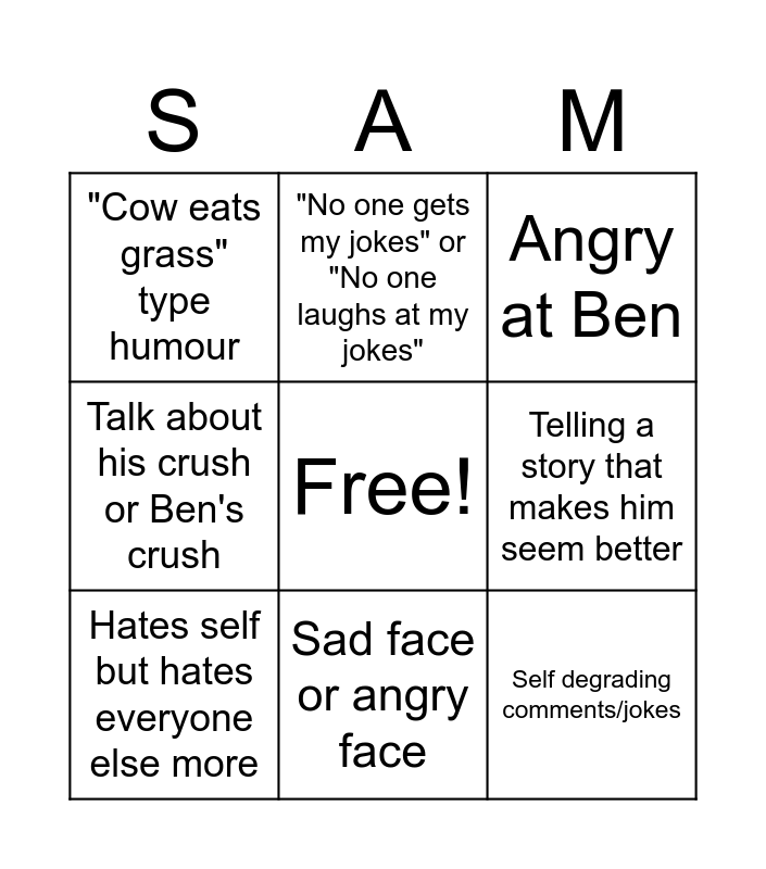 This bingo card has a free space and 19 words: Hand to chin, Shirt Tug, Angry at Ben, Extremely angry over mild inconveniences, Awkward laugh, Self degrading comments/jokes, Dark humour, "Cow eats grass" type humour, "No one gets my jokes" or "No one laughs at my jokes", Nonchalant light skin stare, Repeating stories/comments, Telling a story that makes him seem better, Hates self but hates everyone else more, Mood swing, Youth pastor fit, Complaining how bad his life is, Talk about his crush or Ben's crush, Sad face or angry face and Complain about the heat.