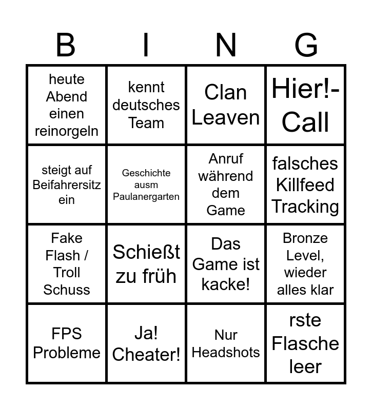 This bingo card has 16 words: Ja! Cheater!, Bronze Level, wieder alles klar, Clan Leaven, heute Abend einen reinorgeln, Fake Flash / Troll Schuss, kennt deutsches Team, Das Game ist kacke!, Nur Headshots, steigt auf Beifahrersitz ein, Geschichte ausm Paulanergarten, FPS Probleme, Hier!-Call, Schießt zu früh, falsches Killfeed Tracking, Anruf während dem Game and rste Flasche leer.