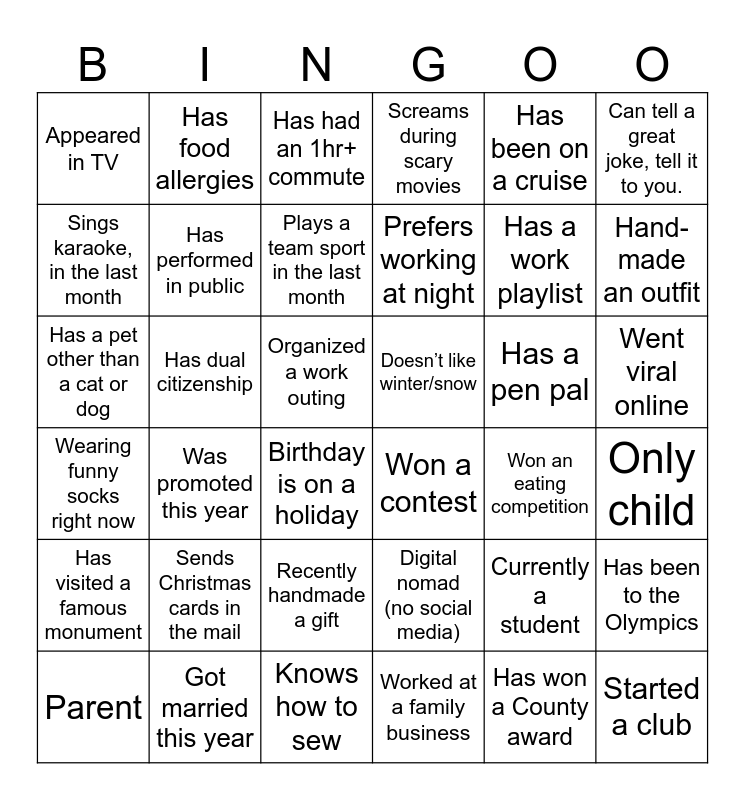 This bingo card has 151 words: Has visited more than 5 countries, Speaks three plus languages, Has run a marathon, Played a musical instrument this month, which one?, Reads more than 10 books a year, Has met someone famous, who?, Volunteered in the past month, Knows how to code, Owns a business, Has worked in another country (not Juarez), Can solve a Rubik's Cube in less than 3 minutes, Practices a martial art (in the last month), Plays a team sport in the last month, Can dance a specific style, which one, Sings karaoke, in the last month, Can tell a great joke, tell it to you., Has played a board game in the last month, Knows how to juggle, Has baked cookies in the last month, Has worked in multiple departments (not divisions), Has worked at the County at least 25 years, Has won a County award, Shares a birthday month with you, Has lived in at least 3 different cities, Has been married at least 15 years, Can dance a traditional dance, Has visited a famous monument, Has dual citizenship, Has changed careers, Is part of a professional association, Has a side business, Has published something (art included), Has read all books by a specific author, Knows how to sew, Has been to Disney World, Is a vegetarian, Hates Coffee, Owns 5+ houseplants, Has a pet other than a cat or dog, Knows how to surf, Has done a DIY project for their home, Has never broken a bone, Has been on a cruise, Has sold something online before (eBay, Facebook Marketplace, etc), Doesn’t watch sports, Has been to a concert in the last month, Has the latest iPhone/Android, Has gone horseback riding, Doesn’t like winter/snow, Knows how to read tarot, Knows ASL, Appeared in TV, Went viral online, Owns a gaming computer, Has an unusual family tradition, Loves true crime podcasts, Likes pineapple on pizza, Loves roller coasters, Does Yoga, Can do a cartwheel, Started a club, Has been to the Olympics, Has a pen pal, Spelling bee champ, Has been on a road trip, Sends Christmas cards in the mail, Screams during scary movies, Was in a play, Good at escape rooms, Has been skydiving, Won an eating competition, Wearing funny socks right now, Won at a casino $1000+, Owns same car brand as you, Never flown on an airplane, Never learned to ride a bike, Collects something, Goes all-out on holiday decorating, Recently handmade a gift, Has performed in public, Has a BFF from high school they still talk to, Currently a student, Took a how-to class recently, Attended high school reunion, Has food allergies, Has a nickname, Birthday is on a holiday, Has a bucket list, Good cook, Taught a class, Worked at a family business, Visited 4+ continents, Had a long-distance relationship, Took dance lessons, Won a contest, Gardens, Can bake a cake from scratch, Was in a wedding party this year, Climbed a mountain, Moved in the past year, Owns a boat, Has a big backyard, Digital nomad (no social media), Notary public, Lives in a rural area, Can drive stick, Reads newspapers, Has been in a hot air balloon, Regularly writes reviews, Watches documentaries, Knows calligraphy, Brews beer, Has a snack stash in the office, Drinks 3+ cups coffee a day, Has worked in another industry, Has a work playlist, Has a favorite pen, Has 0 unread emails, Prefers working in the morning, Prefers working at night, Has had an 1hr+ commute, This is their first job, Bikes to work, Carpools, Buys coffee every morning, Buys lunch every day, Organized a work outing, Was promoted this year, Switched divisions this year, Led a project, Only child, Twin or triplet, Military family, Parent, Grandparent, Hand-made an outfit, In a sports league, Read 10+ books this year, Wears contacts, Lives with roommates, Has officiated a wedding, Has been scuba diving, Uses a paper planner, Met partner through online dating, Got engaged this year, Got married this year, Bought a house this year, Bought a car this year, Had a baby this year, From the west coast and From the east coast.