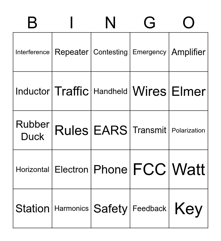 This bingo card has a free space and 104 words: Adapter, Amateur, Amplifier, Ampere, Analog, Antenna, ARRL, Audio, Battery, Baud, Bandwidth, Call Sign, Capacitor, Circuit, Class, Club, Contesting, Conductor, CQ, Current, Decibel, Diode, Digital, Doppler, Duplex, Electron, Elmer, Emergency, Energy, Farad, FCC, Feedback, Food, Frequency, Fuse, Gain, Ground, Ham, Handheld, Harmonics, Hertz, Horizontal, Impedance, Inductor, Insulator, Interference, Isotropic, Key, Kilo, License, Log, Members, Microphone, Mode, Morse Code, Net Control, Noise, Ohm, Paddle, Phone, Polarization, Power, Propagation, QSL Card, Radio, Ragchew, Receiver, Repeater, Rubber Duck, Rules, Safety, Shack, Sideband, Signal, Splatter, Simplex, Spurs, Station, Sunspots, Surge, Switch, SWR, Traffic, Transistor, Transmit, Troposphere, Ultraviolet, Uplink, Vanity Call, Vertical, Voice, Volt, Volunteer, Watt, Wavelength, Whip antenna, Wind, Wires, Yagi, QTH, QSL, QRZ, Clear and Field Day.