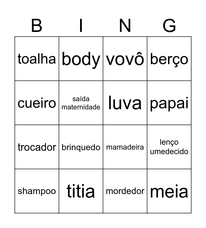 This bingo card has 32 words: Free!, fralda, lenço umedecido, tesoura, meia, luva, cueiro, talco, body, mamãe, papai, vovô, vovó, titio, titia, menino, menina, mamadeira, chupeta, pano de boca, babador, chocalho, mordedor, sabonete, shampoo, berço, trocador, saída maternidade, toalha, papinha, banheira and brinquedo.