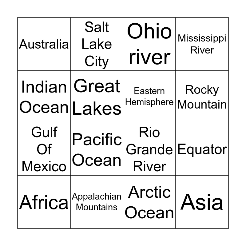 This bingo card has a free space and 15 words: Africa, Asia, Ohio river, Australia, Rocky Mountain, Indian Ocean, Pacific Ocean, Arctic Ocean, Great Lakes, Gulf Of Mexico, Equator, Mississippi River, Eastern Hemisphere, Salt Lake City and Appalachian Mountains.