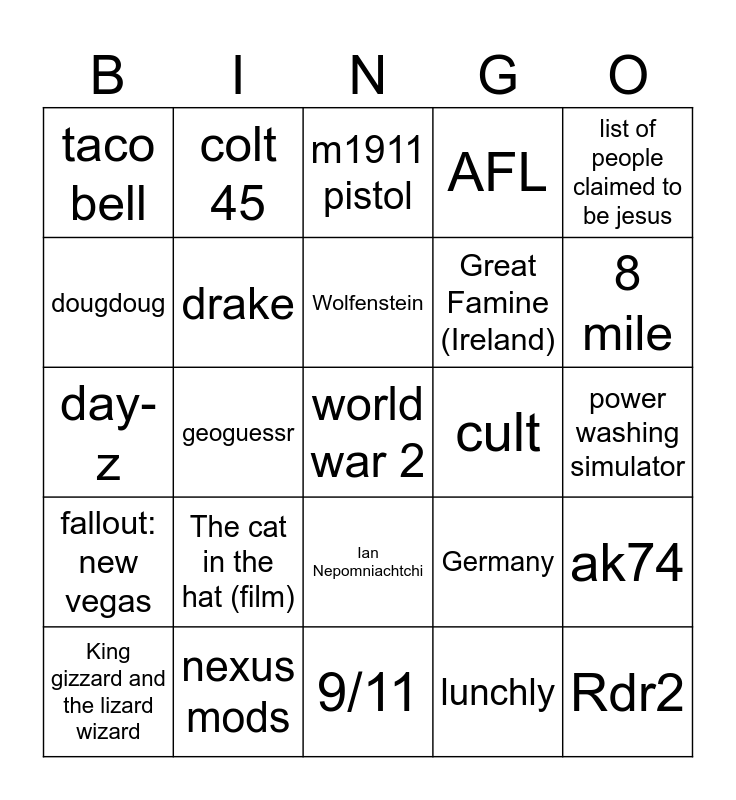 This bingo card has 25 words: The cat in the hat (film), 9/11, Wolfenstein, King gizzard and the lizard wizard, list of people claimed to be jesus, taco bell, dougdoug, colt 45, cult, Ian Nepomniachtchi, Great Famine (Ireland), day-z, Germany, ak74, drake, Rdr2, power washing simulator, m1911 pistol, 8 mile, geoguessr, world war 2, nexus mods, fallout: new vegas, AFL and lunchly.