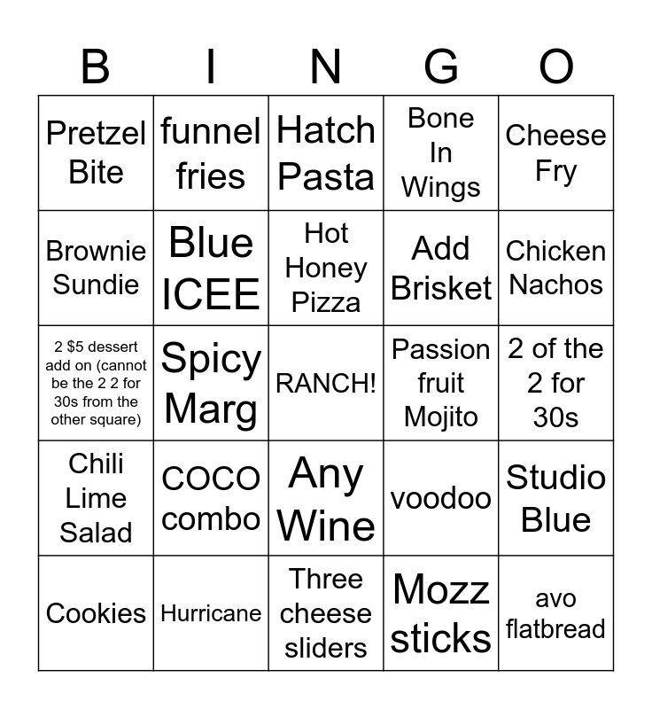 This bingo card has a free space and 24 words: COCO combo, Hurricane, Hot Honey Pizza, Cookies, Cheese Fry, Pretzel Bite, Brownie Sundie, funnel fries, Passion fruit Mojito, Any Wine, Add Brisket, 2 $5 dessert add on (cannot be the 2 2 for 30s from the other square), voodoo, Studio Blue, Blue ICEE, Mozz sticks, 2 of the 2 for 30s, Hatch Pasta, Chicken Nachos, Spicy Marg, avo flatbread, Chili Lime Salad, Bone In Wings and Three cheese sliders.