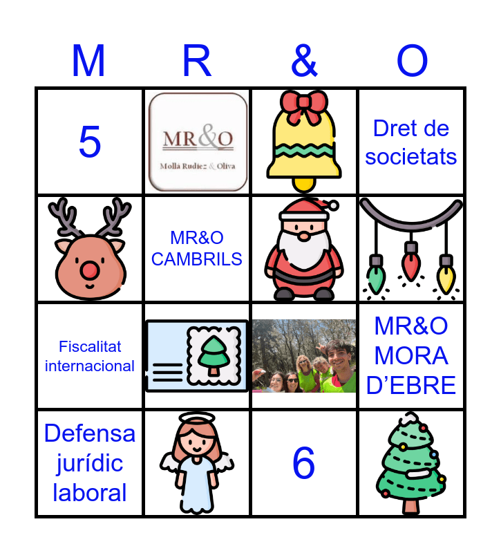 This bingo card has 18 images and 16 words: 1, 2, 3, 4, 5, 6, Contractació mercantil i civil, Defensa jurídic laboral, Dret de societats, Fiscalitat empresarial, Fiscalitat internacional, MR&O CAMBRILS, MR&O FLIX, MR&O MORA D’EBRE, MR&O TARRAGONA and Procediment tributari.