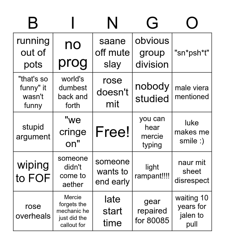 This bingo card has a free space and 24 words: someone didn't come to aether, Mercie forgets the mechanic he just did the callout for, rose doesn't mit, rose overheals, "sn*psh*t", running out of pots, "that's so funny" it wasn't funny, no prog, you can hear mercie typing, someone wants to end early, nobody studied, stupid argument, light rampant!!!!, naur mit sheet disrespect, world's dumbest back and forth, gear repaired for 80085, luke makes me smile :), saane off mute slay, male viera mentioned, "we cringe on", waiting 10 years for jalen to pull, wiping to FOF, obvious group division and late start time.