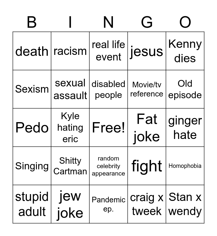 This bingo card has a free space and 24 words: Shitty Cartman, jew joke, disabled people, stupid adult, Kenny dies, death, Sexism, racism, Fat joke, random celebrity appearance, Movie/tv reference, Pedo, fight, Homophobia, sexual assault, craig x tweek, ginger hate, real life event, Old episode, Kyle hating eric, Stan x wendy, Singing, jesus and Pandemic ep..