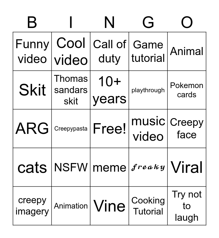 This bingo card has a free space and 24 words: NSFW, Animation, 10+ years, creepy imagery, Animal, Funny video, Skit, Cool video, music video, meme, playthrough, ARG, 𝓯𝓻𝓮𝓪𝓴𝔂, Viral, Thomas sandars skit, Cooking Tutorial, Creepy face, Call of duty, Pokemon cards, Creepypasta, Try not to laugh, cats, Game tutorial and Vine.
