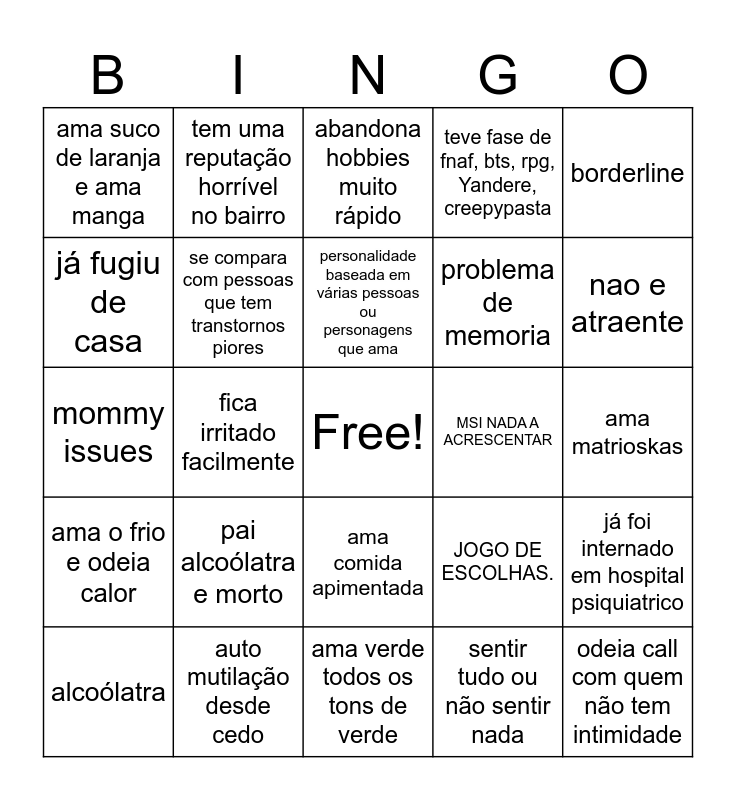 This bingo card has a free space and 24 words: pai alcoólatra e morto, auto mutilação desde cedo, personalidade baseada em várias pessoas ou personagens que ama, alcoólatra, borderline, ama suco de laranja e ama manga, já fugiu de casa, tem uma reputação horrível no bairro, MSI NADA A ACRESCENTAR, ama comida apimentada, problema de memoria, mommy issues, JOGO DE ESCOLHAS., já foi internado em hospital psiquiatrico, se compara com pessoas que tem transtornos piores, sentir tudo ou não sentir nada, ama matrioskas, abandona hobbies muito rápido, nao e atraente, fica irritado facilmente, odeia call com quem não tem intimidade, ama o frio e odeia calor, teve fase de fnaf, bts, rpg, Yandere, creepypasta and ama verde todos os tons de verde.