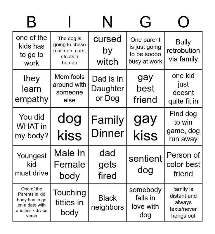 This bingo card has a free space and 24 words: Male In Female body, Touching titties in body, Dad is in Daughter or Dog, One of the Parents in kid body has to go on a date with another kid/vice versa, Bully retrobution via family, one of the kids has to go to work, they learn empathy, The dog is going to chase mailmen, cars, etc as a human, gay kiss, dad gets fired, gay best friend, You did WHAT in my body?, sentient dog, Person of color best friend, Mom fools around with someone else, somebody falls in love with dog, Find dog to win game, dog run away, cursed by witch, one kid just doesnt quite fit in, dog kiss, family is distant and always texts/never hengs out, Youngest kid must drive, One parent is just going to be soooo busy at work and Black neighbors.