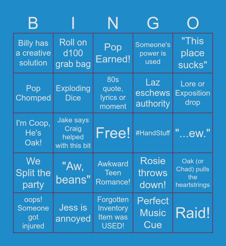 This bingo card has a free space and 24 words: "Aw, beans", Jess is annoyed, 80s quote, lyrics or moment, oops! Someone got injured, "This place sucks", Billy has a creative solution, Pop Chomped, Roll on d100 grab bag, #HandStuff, Awkward Teen Romance!, Laz eschews authority, I'm Coop, He's Oak!, Rosie throws down!, Oak (or Chad) pulls the heartstrings, Exploding Dice, Perfect Music Cue, "...ew.", Pop Earned!, Lore or Exposition drop, Jake says Craig helped with this bit, Raid!, We Split the party, Someone's power is used and Forgotten Inventory Item was USED!.