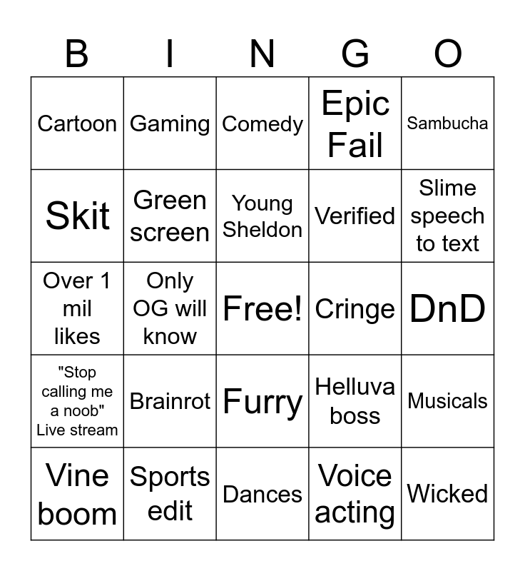 This bingo card has a free space and 24 words: Brainrot, Sports edit, Young Sheldon, Vine boom, Sambucha, Cartoon, Skit, Gaming, Cringe, Furry, Verified, Over 1 mil likes, Helluva boss, Musicals, Green screen, Voice acting, DnD, Comedy, Slime speech to text, Only OG will know, Wicked, "Stop calling me a noob" Live stream, Epic Fail and Dances.
