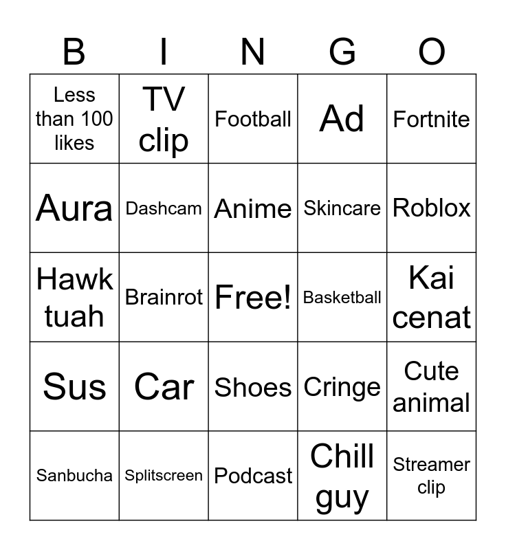 This bingo card has a free space and 24 words: Car, Splitscreen, Anime, Sanbucha, Fortnite, Less than 100 likes, Aura, TV clip, Basketball, Shoes, Skincare, Hawk tuah, Cringe, Cute animal, Dashcam, Chill guy, Kai cenat, Football, Roblox, Brainrot, Streamer clip, Sus, Ad and Podcast.