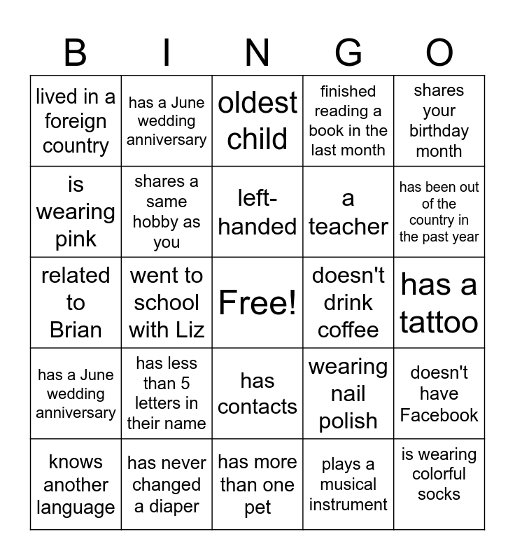 This bingo card has a free space and 29 words: knows another language, owns a business, went to school with Liz, drives the same color car as me, lived in a foreign country, oldest child, shares a same hobby as you, has less than 5 letters in their name, doesn't drink coffee, has never changed a diaper, has a tattoo, is wearing colorful socks, has more than one pet, plays a musical instrument, has been out of the country in the past year, has seen the same band in concert as you, has contacts, has a June wedding anniversary, shares your birthday month, related to Brian, wearing nail polish, under 6 years old, a teacher, is wearing pink, finished reading a book in the last month, has a June wedding anniversary, doesn't have Facebook, left-handed and retired.