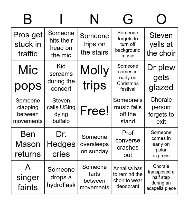 This bingo card has a free space and 24 words: Dr. Hedges cries, Someone drops a hydroflask, Molly trips, A singer faints, Steven yells at the choir, Pros get stuck in traffic, Mic pops, Someone hits their head on the mic, Someone’s music falls off the stand, Someone oversleeps on sunday, Someone comes in early on Christmas festival, Someone clapping between movements, Prof converse crashes out, Someone comes in early on polar express, Kid screams during the concert, Annalisa has to remind the choir to wear deodorant, Chorale person forgets to exit, Someone trips on the stairs, Dr plew gets glazed, Steven calls USing dying buffalo, Chorale transposed a half step during an acapella piece, Ben Mason returns, Someone forgets to turn off background music and Someone farts between movements.