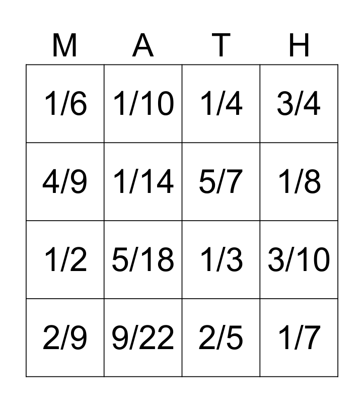This bingo card has 19 words: 1/3, 2/15, 1/4, 1/7, 3/10, 4/9, 2/5, 1/6, 1/10, 1/2, 5/18, 1/14, 5/7, 9/22, 2/9, 4/15, 3/4, 1/8 and 5/9.