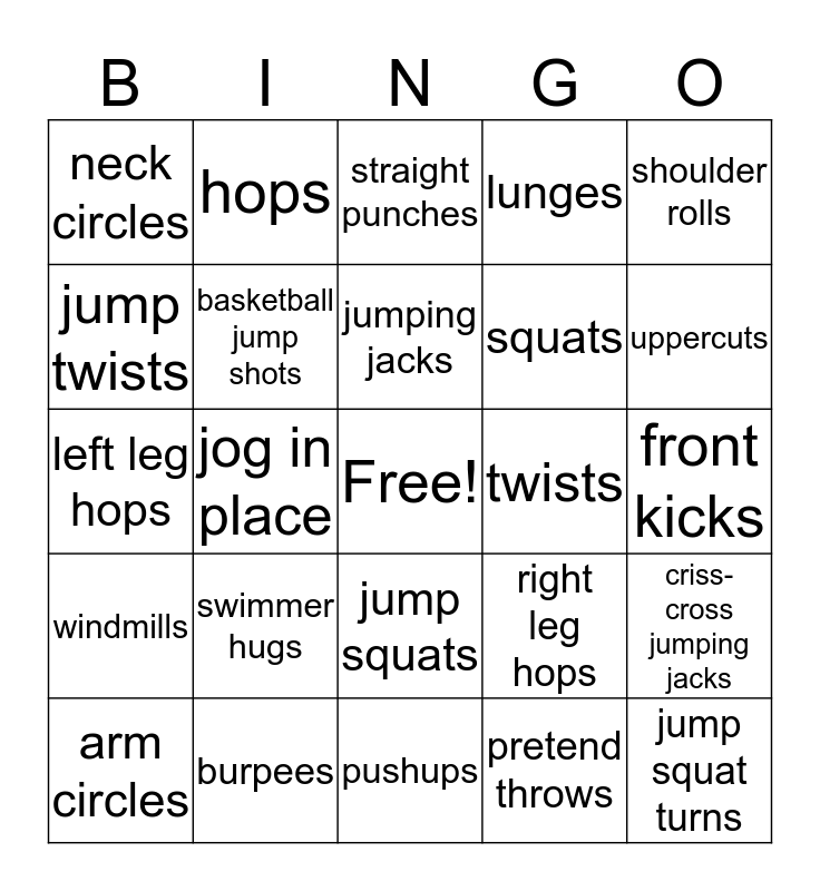 This bingo card has a free space and 24 words: swimmer hugs, burpees, jumping jacks, arm circles, shoulder rolls, neck circles, jump twists, hops, twists, jump squats, squats, left leg hops, right leg hops, criss-cross jumping jacks, basketball jump shots, pretend throws, front kicks, straight punches, uppercuts, jog in place, jump squat turns, windmills, lunges and pushups.