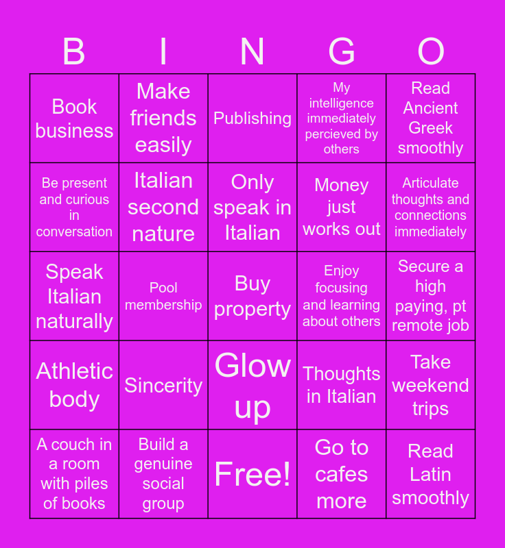 This bingo card has 25 words: Athletic body, Build a genuine social group, Buy property, Go to cafes more, Read Ancient Greek smoothly, Book business, Make friends easily, Publishing, Enjoy focusing and learning about others, Take weekend trips, Be present and curious in conversation, Italian second nature, Free!, Thoughts in Italian, Articulate thoughts and connections immediately, A couch in a room with piles of books, Pool membership, Only speak in Italian, Money just works out, Secure a high paying, pt remote job, Speak Italian naturally, Sincerity, Glow up, My intelligence immediately percieved by others and Read Latin smoothly.