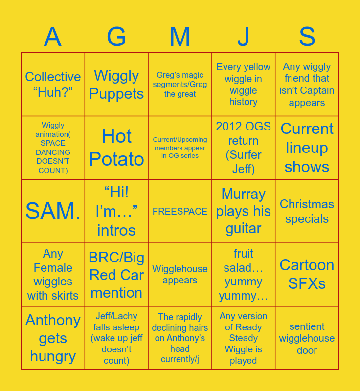This bingo card has a free space and 24 words: BRC/Big Red Car mention, Jeff/Lachy falls asleep (wake up jeff doesn’t count), Current/Upcoming members appear in OG series, Anthony gets hungry, Any wiggly friend that isn’t Captain appears, Collective “Huh?”, Wiggly animation( SPACE DANCING DOESN’T COUNT), Wiggly Puppets, Murray plays his guitar, Wigglehouse appears, 2012 OGS return (Surfer Jeff), SAM., fruit salad… yummy yummy…, Cartoon SFXs, Hot Potato, Any version of Ready Steady Wiggle is played, Christmas specials, Greg’s magic segments/Greg the great, Current lineup shows, “Hi! I’m…” intros, sentient wigglehouse door, Any Female wiggles with skirts, Every yellow wiggle in wiggle history and The rapidly declining hairs on Anthony’s head currently/j.