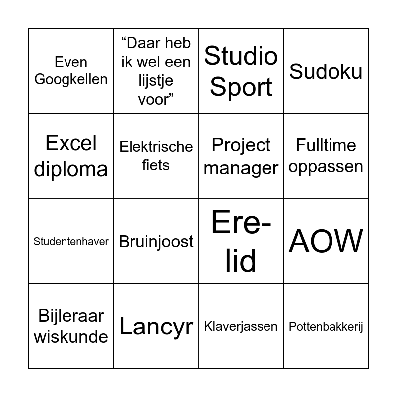 This bingo card has 34 words: Geraniums, Padellen, 298 Squadron, Delta Lloyd, Pottenbakkerij, Project manager, Excel diploma, SDO, “Daar heb ik wel een lijstje voor”, Kleinkinderen, Fulltime oppassen, Studio Sport, Live-sportverslaggever, MN, Lancyr, Bruinjoost, Help mijn man is klusser, Ere-lid, Vechtlust, Linzenschotel, Skuumkoppe, Zeuven, Even Googkellen, Klaverjassen, Afspraak is afspraak, Bijleraar wiskunde, Sudoku, Even een kwartiertje puzzelen, Studentenhaver, Elektrische fiets, Waarom, AOW, Opa and Duplo architect.