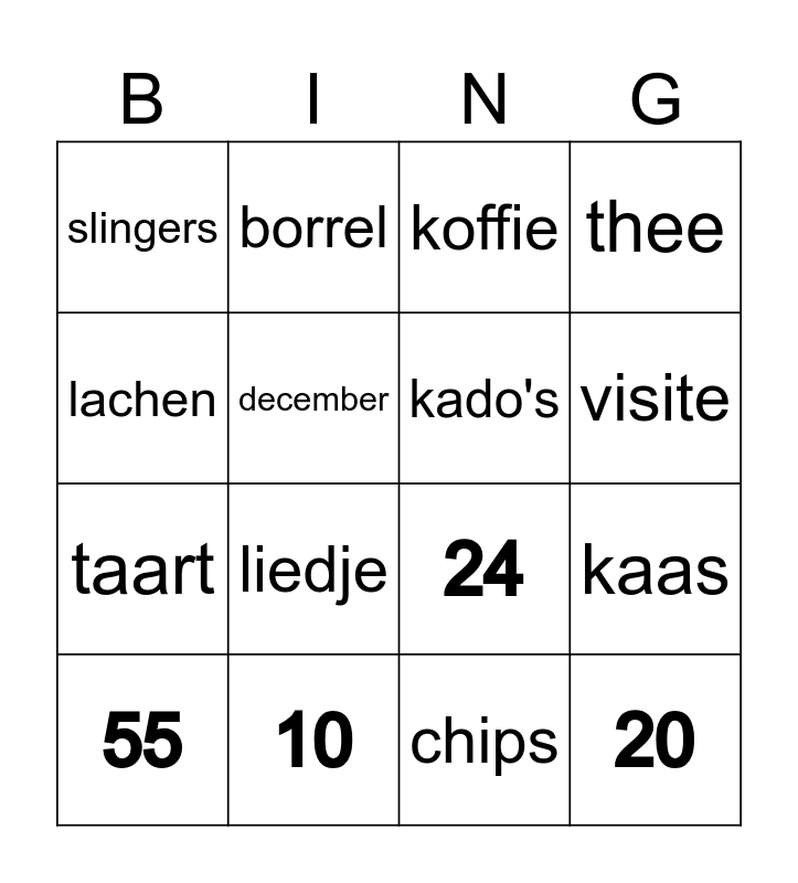 This bingo card has 16 words: 10, kaas, koffie, slingers, taart, borrel, 24, chips, lachen, december, 55, thee, liedje, visite, kado's and 20.