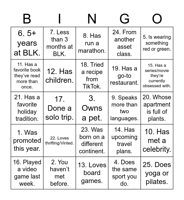 This bingo card has 25 words: 1. Was promoted this year., 2. You haven’t met before., 3. Owns a pet., 4. Does the same sport you do., 5. Is wearing something red or green., 6. 5+ years at BLK., 7. Less than 3 months at BLK., 8. Has run a marathon., 9. Speaks more than two languages., 10. Has met a celebrity., 11. Has a favorite book they’ve read more than once., 12. Has children., 13. Loves board games., 14. Has upcoming travel plans., 15. Has a series/movie they’re currently obsessed with., 16. Played a video game last week., 17. Done a solo trip., 18. Tried a recipe from TikTok., 19. Has a go-to restaurant., 20. Whose apartment is full of plants., 21. Has a favorite holiday tradition., 22. Loves thrifting/Vinted., 23. Was born on a different continent., 24. From another asset class. and 25. Does yoga or pilates..
