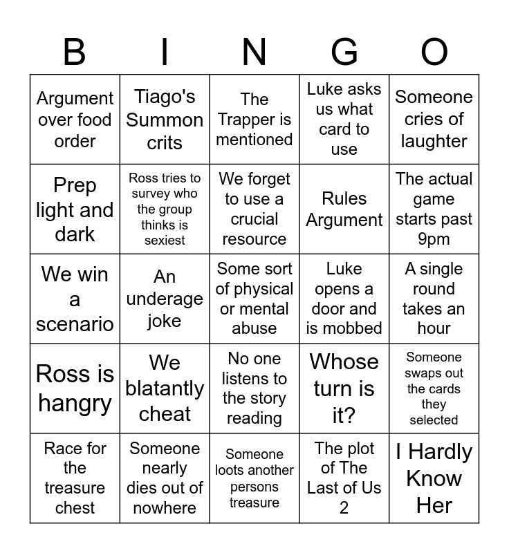 This bingo card has 31 words: Someone loots another persons treasure, A scenario takes 4+ hours, An underage joke, Someone turns up late, Argument over food order, The Trapper is mentioned, Ross tries to survey who the group thinks is sexiest, Whose turn is it?, Luke opens a door and is mobbed, The plot of The Last of Us 2, A single round takes an hour, Some sort of physical or mental abuse, I Hardly Know Her, Seth bails early, The actual game starts past 9pm, Squashies, Someone swaps out the cards they selected, We blatantly cheat, Ross is hangry, No one listens to the story reading, Someone cries of laughter, We lose a scenario, Race for the treasure chest, Tiago's Summon crits, Rules Argument, Prep light and dark, Luke asks us what card to use, We win a scenario, Someone nearly dies out of nowhere, We forget to use a crucial resource and Who put jazz on?.