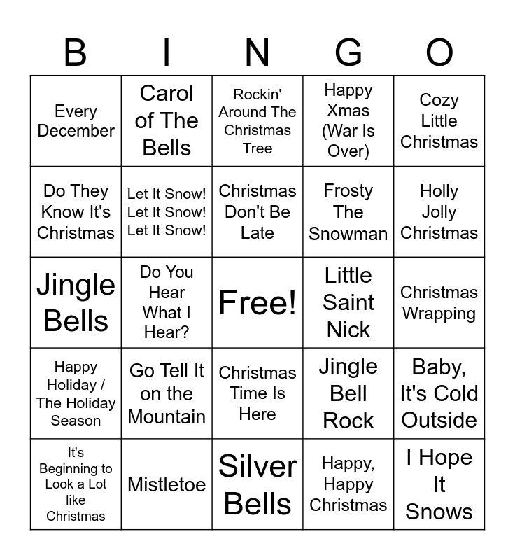 This bingo card has a free space and 67 words: A Holly Jolly Christmas, All I Want for Christmas Is You, Auld Lang Syne, Baby, It's Cold Outside, Blue Christmas, Bring Me Love, Carol of The Bells, Christmas (Baby Please Come Home), Christmas Don't Be Late, Christmas In The Midwest, Christmas Time Is Here, Christmas Tree Farm, Christmas Wrapping, Cozy Little Christmas, Deck The Hall, Do They Know It's Christmas, Do You Hear What I Hear?, Every December, Feliz Navidad, Frosty The Snowman, Go Tell It on the Mountain, Happy Holiday / The Holiday Season, Happy Xmas (War Is Over), Happy, Happy Christmas, Hark! The Herald Angels Sing, Have Yourself a Merry Little Christmas, Here Comes Santa Claus, Home for the Holiday, Holly Jolly Christmas, I Got My Love To Keep Me Warm, I Hope It Snows, I Saw Mommy Kissing Santa Claus, I'll Be Home for Christmas, It Came Upon a Midnight Clear, It's a Marshmallow World, It's Beginning to Look a Lot like Christmas, It's the Most Wonderful Time of the Year, Jingle Bell Rock, Jingle Bells, Joy to the World, Last Christmas, Let It Snow! Let It Snow! Let It Snow!, Little Saint Nick, Looks Like a Cold, Cold Winter, Mary & Joseph, Mele Kalikimaka, Merry Christmas, Happy Holidays, Mistletoe, O Come All Ye Faithful, O Holy Night, Rockin' Around The Christmas Tree, Rudolph the Red-Nosed Reindeer, Run Rudolph Run, Santa Claus Is Coming To Town, Silent Night, Silver Bells, Sleigh Ride, Step Into Christmas, THE PRESENT, The Christmas Song, The First Noel, There Came a Light / O Holy Night, What Are You Doing New Year's Eve, What Christmas Means To Me, White Christmas, Winter Wonderland and Wonderful Christmastime.
