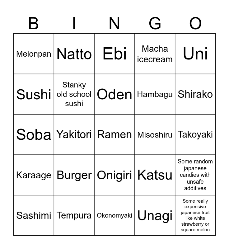 This bingo card has a free space and 24 words: Burger, Tempura, Oden, Sashimi, Uni, Melonpan, Sushi, Natto, Misoshiru, Onigiri, Hambagu, Soba, Katsu, Some random japanese candies with unsafe additives, Stanky old school sushi, Unagi, Takoyaki, Ebi, Shirako, Yakitori, Some really expensive japanese fruit like white strawberry or square melon, Karaage, Macha icecream and Okonomyaki.
