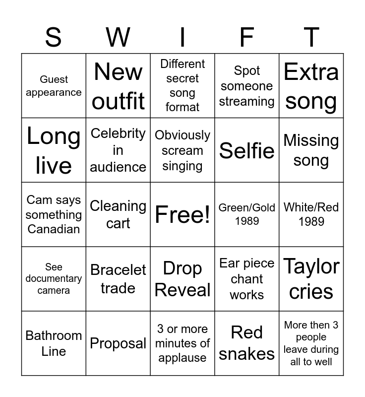 This bingo card has a free space and 24 words: Bracelet trade, Proposal, Obviously scream singing, Bathroom Line, Extra song, Guest appearance, Long live, New outfit, Green/Gold 1989, Drop Reveal, Selfie, Cam says something Canadian, Ear piece chant works, Taylor cries, Celebrity in audience, Red snakes, White/Red 1989, Different secret song format, Missing song, Cleaning cart, More then 3 people leave during all to well, See documentary camera, Spot someone streaming and 3 or more minutes of applause.