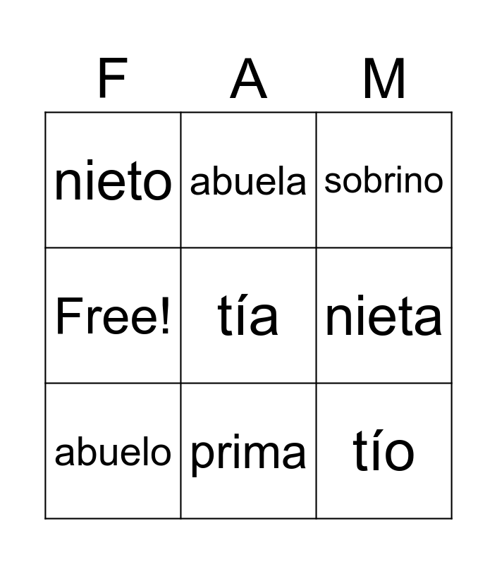 This bingo card has 13 words: madre, padre, abuelo, abuela, Free!, tía, tío, primo, prima, nieto, nieta, sobrino and sobrina.