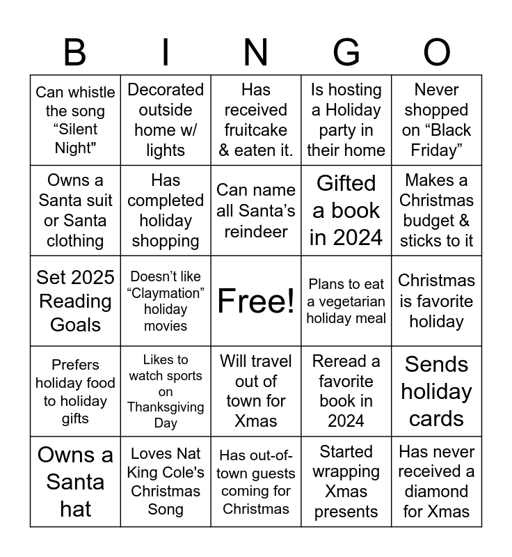 This bingo card has a free space and 37 words: Buys Christmas gifts for pet(s), Hates eggnog, Gone on vacation to escape Holidays, Has completed holiday shopping, Sends holiday cards, Likes to watch sports on Thanksgiving Day, Can name all Santa’s reindeer, Doesn’t like Christmas music, Never shopped on “Black Friday”, Makes holiday cookies from scratch, Doesn’t like “Claymation” holiday movies, Is hosting a Holiday party in their home, Has never received a diamond for Xmas, Christmas is favorite holiday, Owns a Santa suit or Santa clothing, Prefers holiday food to holiday gifts, Drinks tea for breakfast, Has received fruitcake & eaten it., Will travel out of town for Xmas, Plans to eat a vegetarian holiday meal, Can whistle the song “Silent Night", Makes a Christmas budget & sticks to it, Owns a Santa hat, Has out-of-town guests coming for Christmas, Knows how to snow ski, Started wrapping Xmas presents, Decorated outside home w/ lights, Taken a family Christmas photo for 2024, Not putting up a Christmas Tree, Never seen “How the Grinch Stole Christmas”, Watched a Christmas Diva movie, Loves Nat King Cole's Christmas Song, Set 2025 Reading Goals, Visits the Library, Reread a favorite book in 2024, Gifted a book in 2024 and Read a book last night.