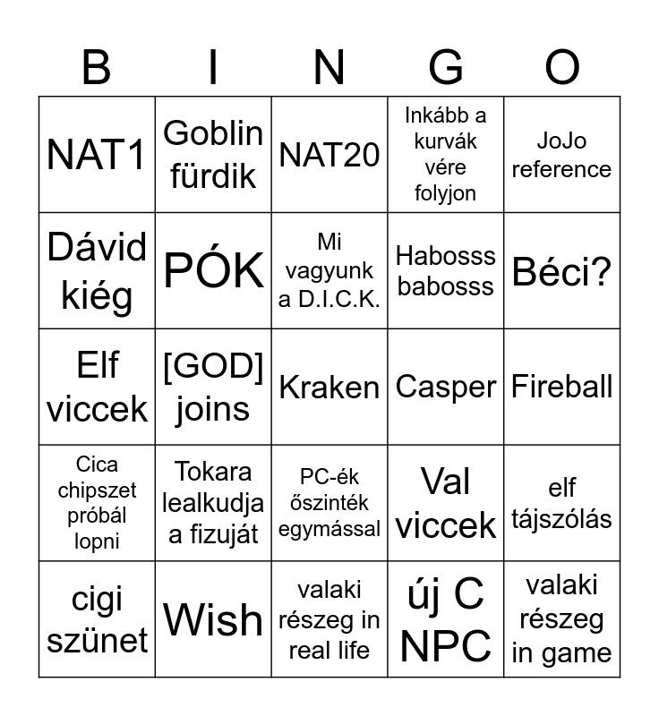 This bingo card has a free space and 29 words: cigi szünet, Baba kockát lop, [GOD] joins, TPK, NAT1, NAT20, PÓK, Tokara lealkudja a fizuját, Casper, Wish, Fireball, valaki részeg in game, valaki részeg in real life, új C NPC, Béci?, PC-ék hátba szúrják egymást, PC-ék őszinték egymással, Cica chipszet próbál lopni, JoJo reference, Elf viccek, Val viccek, Valaki majdnem megfullad, Habosss babosss, Dávid kiég, Inkább a kurvák vére folyjon, Goblin fürdik, elf tájszólás, Mi vagyunk a D.I.C.K. and I have darkvision.