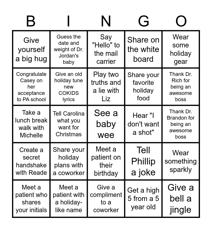 This bingo card has 45 words: Have Shania color a picture for you, See a baby wee, Ask a co-worker about their holiday traditions, Meet a patient who shares your initials, See someone wearing a "Ho, Ho, Ho" shirt, Get a high 5 from a 5 year old, Say "Hello" to the mail carrier, Sing along to a holiday tune, Wear some holiday gear, Meet a patient with a holiday-like name, Share on the white board, Hear "I don't want a shot", Meet a patient on their birthday, Share your holiday plans with a coworker, Eat a sweet treat from the break room, Give a compliment to a coworker, See a kid in holiday PJs, Take a lunch break walk with Michelle, Give a child a sticker, Thank Dr. Rich for being an awesome boss, Guess the date and weight of Dr. Jordan's baby, Give Mary your appreciation for her hard work, Spy an elf (not necessarily on a shelf), Give yourself a big hug, Eat food from a Pearl Street Merchant, Thank Dr. Brandon for being an awesome boss, Give Jessica a warm welcome, Share your favorite holiday tune, Tell Phillip a joke, Create a secret handshake with Reade, Create a power couple name with Janelle, Wear something sparkly, Add a decoration to Emily's work station, Help a coworker complete a task, Share a laugh with Lisa (tell her a funny story), Tell Carolina what you want for Christmas, Give Dr. Kayla a (chocolate) kiss, Bring holiday cookies to share, Give a bell a jingle, Play two truths and a lie with Liz, Congratulate Casey on her acceptance to PA school, Share your favorite holiday food, Sing a holiday song with Sydney, Give an old holiday tune new COKIDS lyrics and Share something you're grateful for.