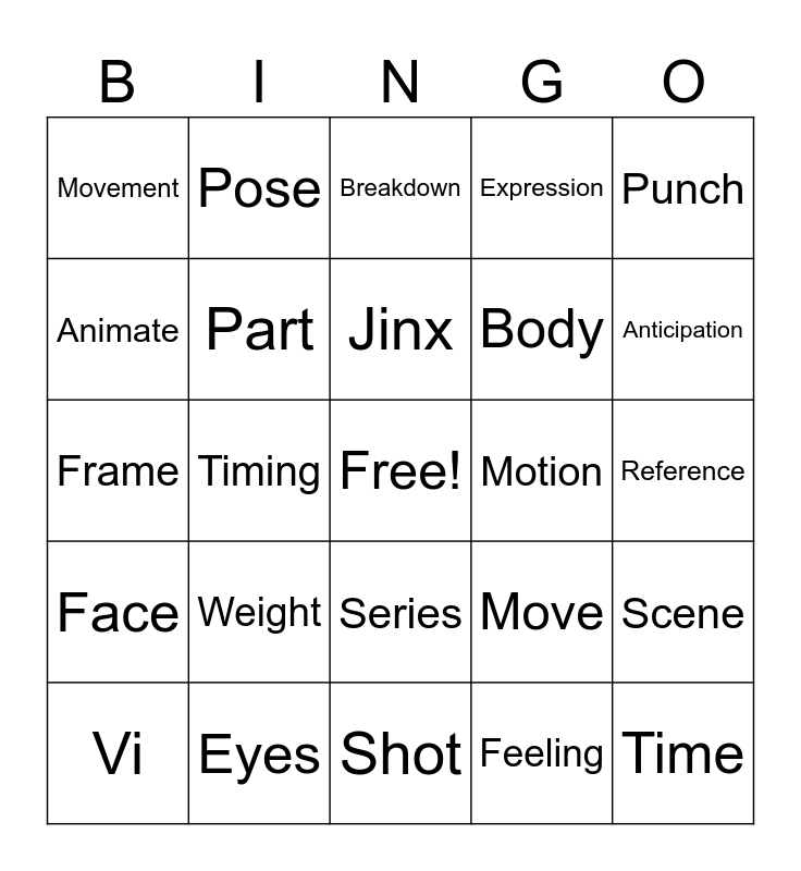 This bingo card has a free space and 24 words: Weight, Eyes, Jinx, Vi, Punch, Movement, Animate, Pose, Motion, Series, Body, Frame, Move, Scene, Part, Feeling, Reference, Breakdown, Anticipation, Timing, Time, Face, Expression and Shot.